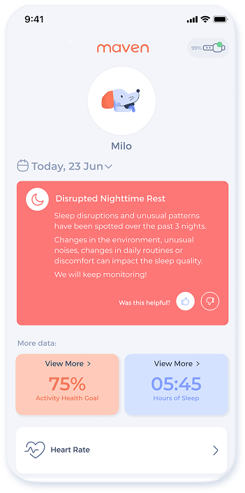 Maven learns your dog’s baseline and flags arthritis pain patterns in real time by tracking rest, sleep interruptions, total activity, and excited time.